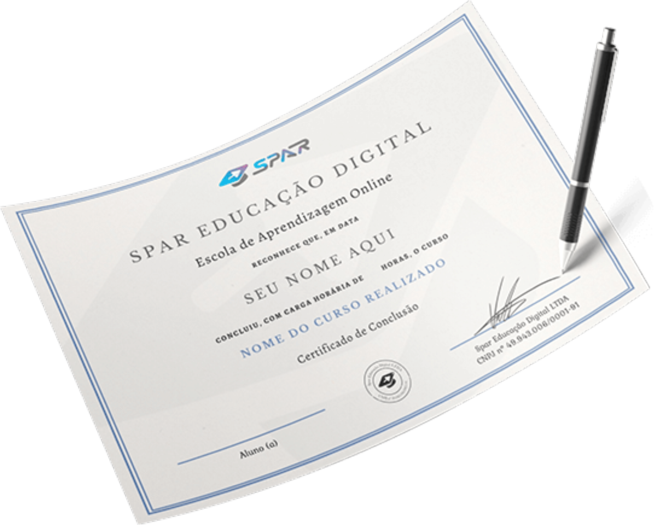 Você vai ter acesso a este lindo certificado, emitido pela Spar Educação Digital, disponível em sua área restrita após concluir o curso.